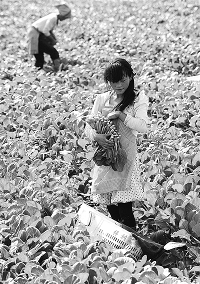 在宁夏回族自治区永宁县望洪镇供港蔬菜基地内,农民正在采摘成熟的菜心。截至目前,当地已建成供港蔬菜基地1.2万亩,年销售量2800多吨,年总产值达到3600万元以上。 新华社记者 彭昭之摄