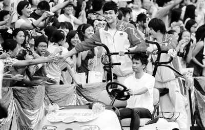 8月25日,伦敦奥运会游泳金牌运动员孙杨(中)与市民握手。