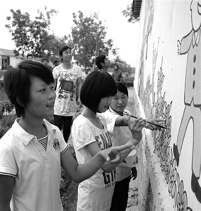 在山东沾化县富国街道打磨李村文化广场,村民正在文化墙上绘画。近年来,该县大力推进文明村建设,建立村文化广场,丰富了村民文化生活。 本报记者 李树贵摄