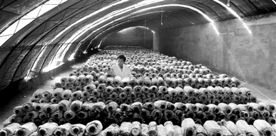 在陕西靖边县席麻湾乡大沟村的一座食用菌生产大棚内,一位农民在检查蘑菇的生长状况。