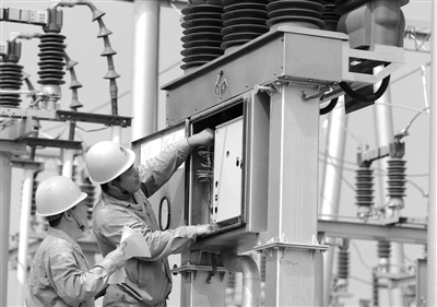 8月27日,河北献县电力局工作人员在辖区变电站检查设备运行情况。河北献县电力局面对今夏高温多雨等恶劣复杂天气,做好电网监视、设备运行、事故抢修等安全保障工作,加强变电站及线路巡视,及时掌握雨情,确保电网安全稳定运行。 本报记者 赵 晶摄