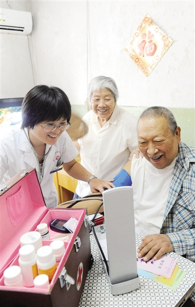 北京市顺义区建新北区服务站王宏伟医生(左一)来到王玉铎(右一)家中义诊。