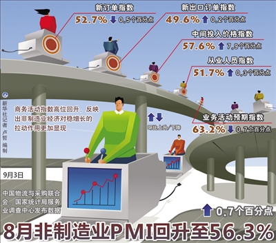 由于非制造业没有综合指数,通常以商务活动指数来反映非制造业经济的总体变化。中国物流与采购联合会副会长蔡进表示,8月份,商务活动指数高位回升,反映出非制造业经济对稳增长的拉动作用更加显现。特别是零售、住宿餐饮等消费性服务业的显著回升以及信息服务业的活跃,为稳增长奠定了坚实的基础。