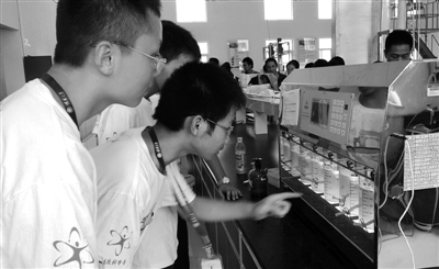 “哇!”刚踏进清华大学苏伊士环境科学与工程实验中心的大门,一群十六七岁的少年就被眼前一排排精密的显微镜所震撼,按捺不住心中的激动异口同声地尖叫起来。随后,大家便迫不及待地“忙”了起来。“老师,这个瓶子里装的是什么液体?”“老师,这个仪器是做什么用的?”……这是8月8日下午清华大学科学营的一幕。