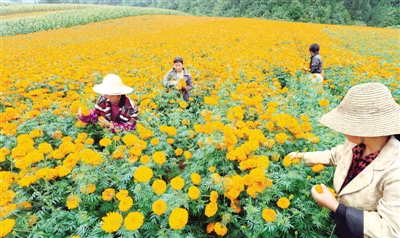 ◁ 9月5日,文山市杜孟村村民在采摘经济作物万寿菊。