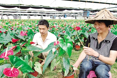 李高加东(左)和陈米仙(右)夫妇在福建省漳平市永福镇金盛花场修剪花枝(9月6日摄)。永福镇是福建省“三大花乡”之一,目前当地花农种植名优花卉面积已达3.5万亩,2011年花卉总产值达10亿元。