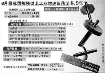 今年以来,我国经济增速放缓的主要表现是实体经济,尤其是工业生产增速的持续放缓。去年我国规模以上工业增加值月度增长一直在11%以上,今年4月,工业增速从3月份的11.9%陡降至9.3%,引起社会各界关注。自中央提出“把稳增长放在更加重要的位置”以来,工业生产大幅下降的势头已经得到初步遏制,进入了缓中趋稳的运行态势。5月、6月、7月、8月工业增速分别为9.6%、9.5%、9.2%、8.9%,月度之间降幅不超过0.3个百分点。