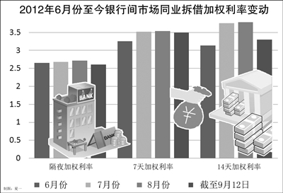 交易数据显示,今年6月份银行间市场同业拆借隔夜、7天、14天加权利率分别为2.6532%、3.2594%、3.1385%。据最新统计,7月份的这3项利率分别为2.6832%、3.5236%、3.7579%;8月份的这3项利率分别为2.7218%、3.5434%、3.7895%。而截至9月12日收盘,上述3项利率分别维持在2.6120%、3.4965%、3.3074%。