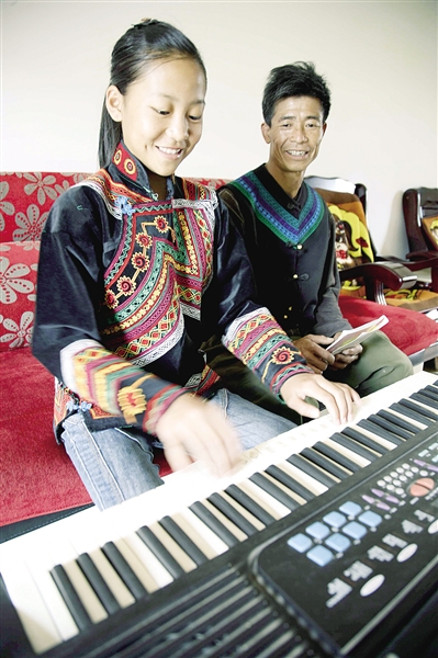 图④:在西昌市开元乡新家里,少数民族姑娘沙马燕燕为父亲弹奏电子琴