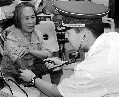 近日,福建南安边防大队联合驻地诊所开展“护老爱幼、上门义诊”主题活动。图为南安边防医疗队队员为留守老人测量血压。 本报记者 吴陆牧摄