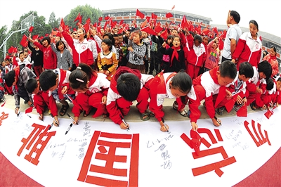 9月17日,在安徽省亳州市谯城区薛阁小学,学生们在“勿忘国耻 爱我中华”横幅上签名。当日,安徽省亳州市谯城区薛阁小学举行了解“九一八”事变的主题教育活动。张延林摄(新华社发)
