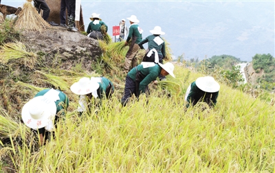 9月21日,岚皋县花里镇农民在抢收成熟的水稻。当日,陕西省岚皋县5个行政村的40多位农民用“打谷”比赛的方式喜迎今秋水稻丰收。近年来,伴随岚皋旅游的崛起,花里镇加大古梯田的保护,恢复梯田原有生态系统,花里镇内98%的稻田复耕复种,年产稻谷近3000吨。新华社记者 陈昌奇摄