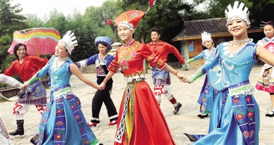 9月29日,在北京中华民族博物院,来自贵州省织金县的演员在跳民族舞,推介当地旅游文化。中秋国庆期间,北京许多公园景区将举办赏花游园等活动,为群众提供丰富的精神大餐。 本报记者 赵 晶摄