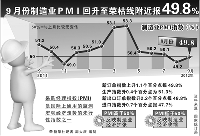 国家统计局服务业调查中心、中国物流与采购联合会10月1日发布的调查报告显示,9月份中国制造业采购经理指数(PMI)为49.8%,比上月回升0.6个百分点,接近临界点(50%),为今年5月份以来连续4个月回落后的首次回升。