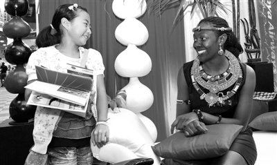 9月30日,在肯尼亚首都内罗毕肯雅塔国际会议中心,一位工作人员在和一名中国女孩交谈。当日,2012“神奇肯尼亚”旅游博览会在内罗毕落幕。由肯尼亚旅游局主办的这次博览会,吸引了来自世界各地170多家旅行社参加。 新华社发
