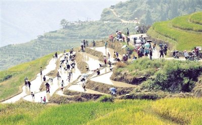 当日,桂林市龙胜各族自治县和平乡龙脊村举办2012年龙脊金秋梯田文化旅游节,当地各族同胞舞龙舞狮、收割稻谷、晾晒粮食、抢抓田鱼,同国庆黄金周来旅游观光的游客一起,在欢声笑语中庆祝龙脊五谷丰登又一秋。
