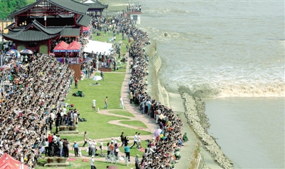 10月3日,大批游客在浙江海宁盐官景区沿岸观看钱塘江“一线潮”。当日是农历八月十八,是每年观看“天下第一潮”——钱塘江大潮的最佳时机。由于恰逢中秋、国庆长假,大量游客聚集在钱塘江沿岸守候观看“一线潮”“回头潮”等景象,领略宋代诗人苏轼笔下“壮观天下无”的气势。