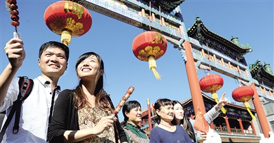 10月5日,游客在北京前门观看民俗文化表演。