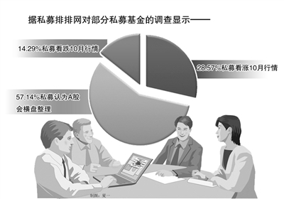 据私募排排网的一项调查显示,28.57%私募看涨10月行情,相比上月下降16.88%,57.14%私募则认为A股会横盘整理,中性观点的私募比上月大幅增加了25.32%,而看跌的私募也相对减少了8.44%,为14.29%。整体而言,私募基金对10月行情谨慎乐观,做多意愿也有所增强。