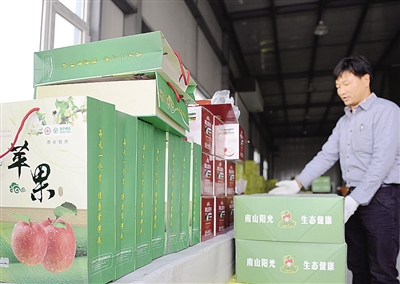 工人在宁夏中卫市永康镇南山阳光果业有限公司整理准备外销的SOD苹果(10月12日摄)。中卫市永康镇通过政府推广、企业运营、农户订单种植的生产模式,发展SOD苹果种植,提升果品品质,每亩可为农户带来纯收入1万多元。SOD是生物体内的重要金属酶类,是一种抗衰老、抗肿瘤、增强免疫的功能性因子,在食品中拥有广泛的应用前景。 新华社记者 王 鹏摄