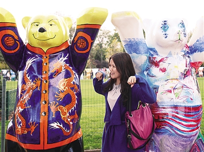 10月13日,在法国巴黎埃菲尔铁塔下的战神广场,一名中国游客与身着唐装的“中国熊”拍照留念。