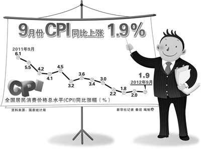 据测算,在9月份1.9%的CPI同比涨幅中,去年价格上涨的翘尾因素约为0.2个百分点,新涨价因素约为1.7个百分点。当前,随着食品价格趋于稳定,食品对推动CPI上涨的作用已经有所减弱。9月份,食品价格上涨2.5%,非食品价格上涨1.7%;食品价格影响居民消费价格总水平同比上涨约0.79个百分点,已经低于非食品价格的影响。