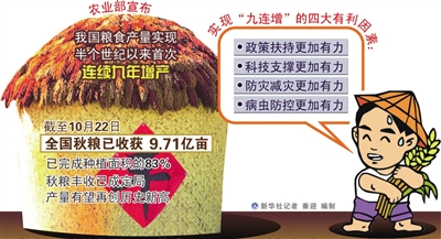 本报北京10月23日讯 记者乔金亮报道:农业部今天宣布,今年秋粮丰收已成定局,我国粮食产量实现半个世纪以来首次连续九年增产。