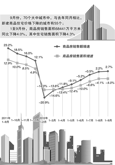 秦虹:总体看,去年下半年以来形成的市场格局尚未出现根本性改变,投机投资性购房得到明显抑制,房价基本平稳,住房总库存量仍处高位。当前房地产市场相对还是稳定的,虽然从6月份开始部分城市房价有所回升,但回升的速度是缓慢的,部分城市房价同比下降,全国商品住房成交面积也是同比下降的。国家统计局的最新数据显示,今年9月份,70个大中城市中,与去年同月相比,新建商品住宅价格下降的城市有55个;1至9月份,商品房销售面积68441万平方米,同比下降4.0%,其中住宅销售面积下降4.3%。