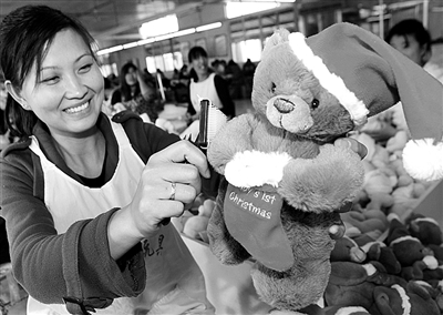 10月22日,江苏省赣榆县塔山镇一家企业的员工在整理销往北京的礼品玩具。距离“圣诞季”尚有两个月,江苏省赣榆县近百家玩具企业已经开始进入圣诞产品生产和销售的高峰期。 司 伟摄(新华社发)