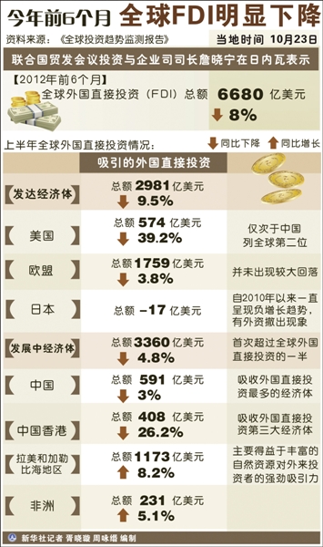 今年上半年流入美国的外国直接投资出现显著下降,同比减少370亿美元。同时,包括中国、俄罗斯、印度、巴西和南非在内的金砖国家也出现外国直接投资下滑现象,同比减少230亿美元。但值得注意的是,发展中经济体在全球外国直接投资总额中所占比例第一次超过了一半以上,而以往发展中经济体的外国直接投资总量需与东南欧、独联体国家等转型经济体的外国直接投资加在一起才能占到全球外国直接投资的一半份额。特别是中国的外国直接投资流入量在2012年前6个月达到591亿美元,虽小幅下跌3个百分点,但仍然超过美国成为最受跨国公司重视的投资国。