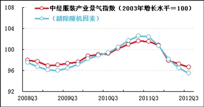 2012年三季度,中经服装产业①景气指数为96.6(2003年增长水平=100),比上季度下降0.6点,连续5个季度回落,但下降幅度有所放缓。