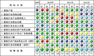 2012年三季度,中经服装产业景气指数为96.6,比上季度下降0.6点,连续5个季度呈现回落态势;中经服装产业预警指数为76.7,比上季度小幅回升3.3点,连续2个季度上行,但仍在偏冷的“浅蓝灯区”。