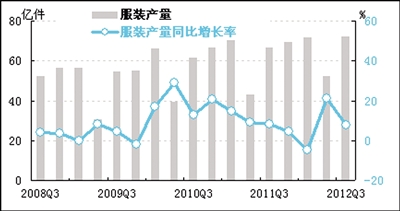 经初步季节调整,三季度我国服装产量为71.9亿件,同比增长7.7%,同比增速较上季度放缓13.6个百分点。由于市场需求不旺,服装企业加大力度促销,调整库存,加上劳动力成本提高,用工需求持续减少,服装产量增长受到较大约束。