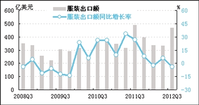 受国际市场需求低迷、国内外棉花价差持续拉大及企业生产成本增加等因素影响,三季度我国服装出口压力明显加大。经初步季节调整,三季度服装出口额为469.1亿美元,同比下降4.1%,由同比增长转为同比下降。本季度服装行业出口交货值占销售收入的比重为35.4%,远高于全部工业11.9%的平均水平。