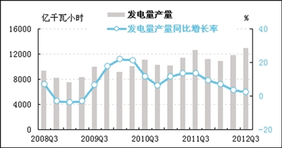 经初步季节调整,三季度全国规模以上电厂发电量为12875.92亿千瓦小时,同比增长2.4%,增速比上季度回落0.8个百分点,维持2011年三季度以来的下探趋势。