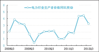 三季度,电力工业品出厂价格总水平同比上涨3.2%,涨幅比上季度缩小1.2个百分点。2011年以来国家对上网电价和销售电价的多次调整,使得今年一季度电力工业品出厂价格涨幅明显提高;二季度虽有全国阶梯电价的全面施行,但因仅适用于居民阶梯电价,在全国电力消费中占比较小,因此二季度价格涨幅趋缓;三季度,随着相关政策的边际效应递减,加上我国经济持续放缓,工业增速回落,电力价格上涨受到一定程度的抑制,因而出现了三季度价格涨幅的回落。