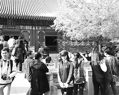 北京香山红叶节日前开幕,吸引大量游人前往观赏。据统计,上周双休日期间游客人数达24万人次,创历史新高。公园部门预计,由于本周红叶变色率将达到80%,周末又将迎来游客高峰。图为游客在景区内摄影留念。 本报记者 张 伟摄