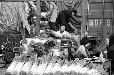 10月30日,在太原市河西农产品批发市场,蔬菜批发商在搬卸大葱。据太原市价格监测中心监测,随着秋冬时令蔬菜大量上市,太原蔬菜市场供应充足,零售价格连续四周回落。在太原市多家农贸市场,大白菜、菠菜、生菜、扁豆等品种降势明显,与上月相比降幅均超过30%。 新华社记者 王飞航摄