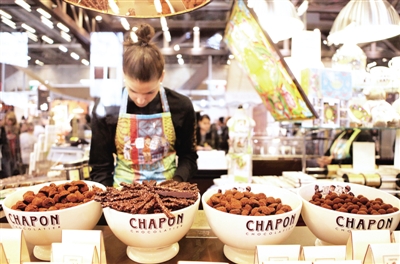 10月31日,一名巧克力商在法国巴黎巧克力沙龙上展示自己的产品。为期5天的第18届巴黎巧克力沙龙当日在巴黎凡尔赛门展览馆拉开帷幕,来自世界各地的约160家巧克力商参展,预计将吸引13万名游客。 新华社发