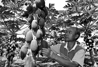 农场工人在查看木瓜长势(10月26日摄)。史庆章是2011年到广西钦州创业的台湾人,目前已进入广西钦州市台湾农民创业园的台资企业还有鸿霖安农林科技公司、五祥种猪场农业企业,预计全年总产值达2.4亿元。 新华社发