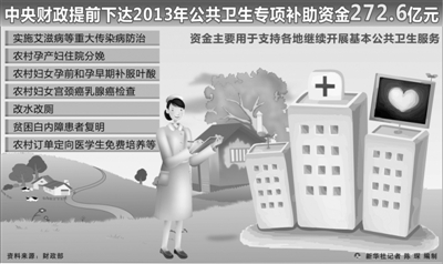 5日,财政部发布通知,中央财政提前下达2013年城镇居民基本医疗保险补助资金预算指标200.38亿元,提前下达2013年新型农村合作医疗补助资金预算指标970.8亿元,用于对全国城乡参保(合)居民进行补助。6日,财政部发布通知,为支持各地统筹安排预算资金,做好2013年公共卫生工作,中央财政将提前下达2013年公共卫生专项补助资金272.6亿元,这些补助资金将主要用于支持各地继续开展基本公共卫生服务,实施艾滋病等重大传染病防治以及农村孕产妇住院分娩、农村妇女孕前和孕早期补服叶酸等重大公共卫生项目。为加快支出进度,财政部7日再次发布通知,中央财政安排实施提前下达的2013年国家基本药物制度补助资金82亿元。补助资金中包括基层医疗卫生机构实施国家基本药物制度补助资金63亿元,村卫生室实施国家基本药物制度补助资金19亿元,由各地统筹用于2013年实施国家基本药物制度的补助。