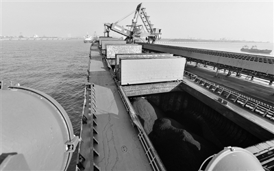 一艘轮船靠泊在秦皇岛港煤炭码头装货。