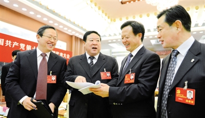 11月9日下午,北京人民大会堂河北厅,河北代表团代表讨论胡锦涛总书记向大会所作的报告。讨论结束后,十八大代表赵世洪、郭华、王爱民(从左至右)等就全面提高党的建设科学化水平进行交流讨论。