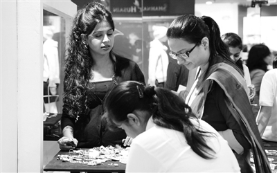 在印度首都新德里市南部商业中心的一家商场里,两名妇女在选购首饰。