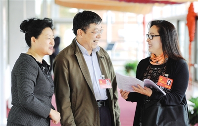 11月11日上午,北京代表团在驻地举行全体会议,十八大代表李瑞华、杜德印、杨凤一(从左至右)等就十八大报告中推动城乡发展一体化,增强文化整体实力和竞争力等内容边走边议。