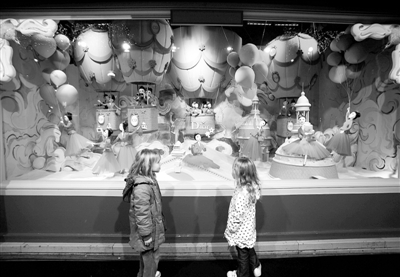 小朋友欣赏法国巴黎春天百货公司的圣诞橱窗。法国巴黎春天百货日前揭幕一年一度的圣诞橱窗,热气球环游巴黎、假面舞会、旋转木马、雪中溜冰……橱窗中的世界好似各种童话中的梦幻场景。