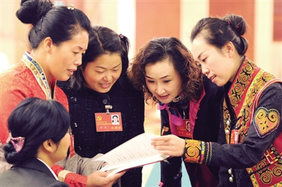 11月13日,来自四川代表团的泽仁旺姆、罗玮、向巧、马剑霞代表(从左至右)在会议结束后,进一步讨论报告中的相关内容。