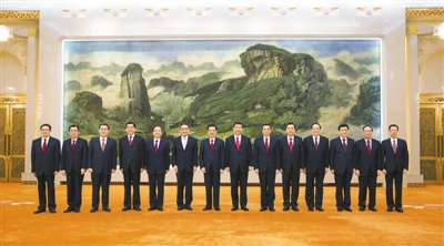 11月15日,国家主席胡锦涛,新当选的中共中央总书记、中共中央军委主席习近平,十七届中共中央政治局其他常委吴邦国、温家宝、贾庆林、李长春、贺国强、周永康,十八届中共中央政治局其他常委李克强、张德江、俞正声、刘云山、王岐山、张高丽一起合影。 新华社记者 兰红光摄