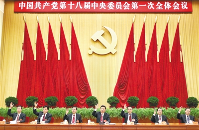 11月15日,中国共产党第十八届中央委员会第一次全体会议在北京人民大会堂举行。习近平、李克强、张德江、俞正声、刘云山、王岐山、张高丽等出席会议。
