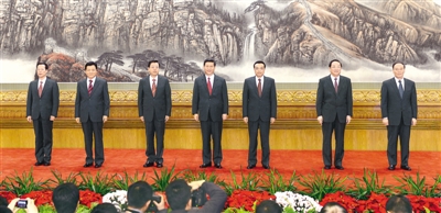 11月15日,刚刚在党的第十八届中央委员会第一次全体会议上当选的中共中央总书记习近平和中共中央政治局常委李克强、张德江、俞正声、刘云山、王岐山、张高丽在北京人民大会堂同采访十八大的中外记者亲切见面。